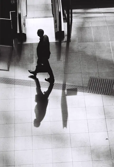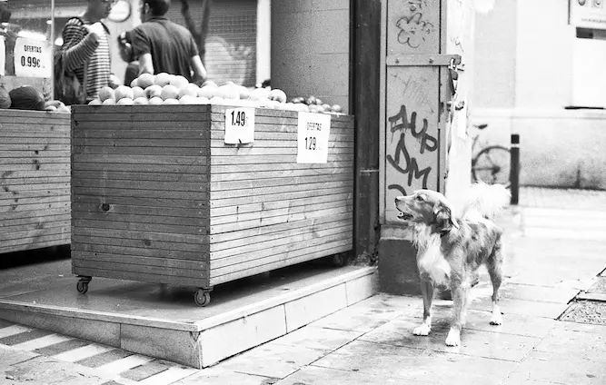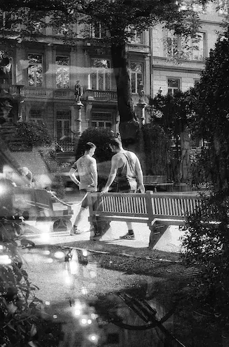 Le noir et blanc argentique est particulièrement adapté à la photographie de rue. Il permet de se détacher de la couleur pour se concentrer sur :